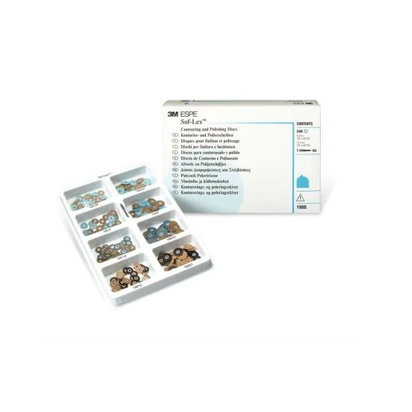 - 120 discos de pulido Sof-Lex™; grano superfino, fino, medio, grueso, 30 uds. de cada uno; Ø 9,5 mm, 120 discos de pulido Sof-Lex™; grano superfino, fino, medio, grueso, 30 uds. de cada uno; Ø 12,7 mm, 1 mandril RA para contra ángulo.