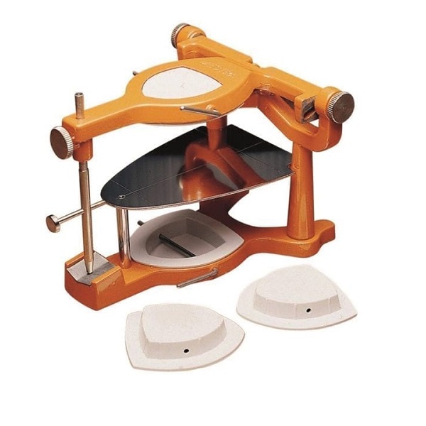 Articulador para Prótesis Balenceadas Mestra. Equipado con bases de plástico desmontables, pudiendo de este modo trabajar con varios modelos a la vez.