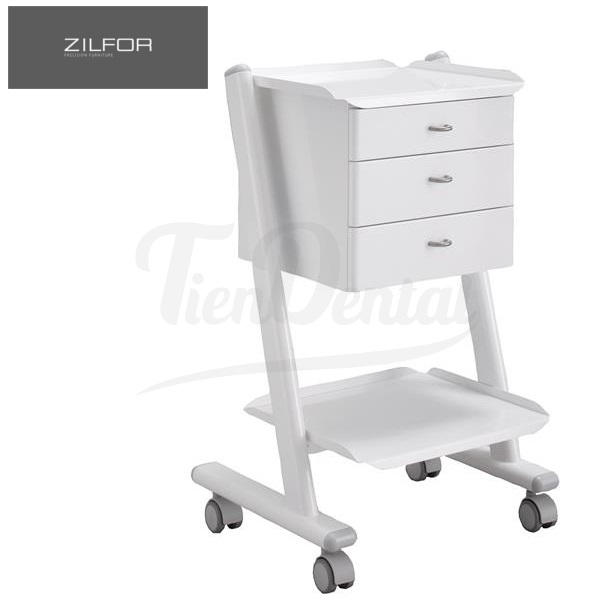 Carrito móvil con 3 cajones C2RK3 Zilfor. Es un carrito metálico con ruedas para el gabinete dental, con 2 estantes con bordes anti caídas y 3 cajones.