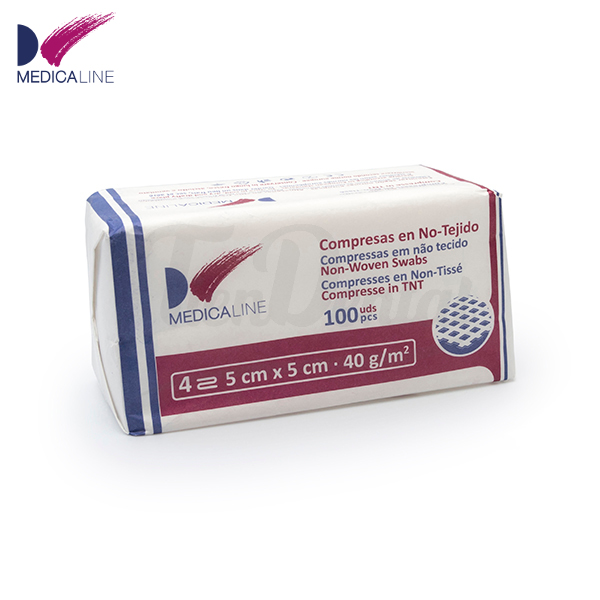 Compresas quirúrgicas Medicaline. Alta capacidad de absorción. Medidas: 5 cm x 5 cm. Gramaje: 40 g/m. Paquete con 100 unidades.