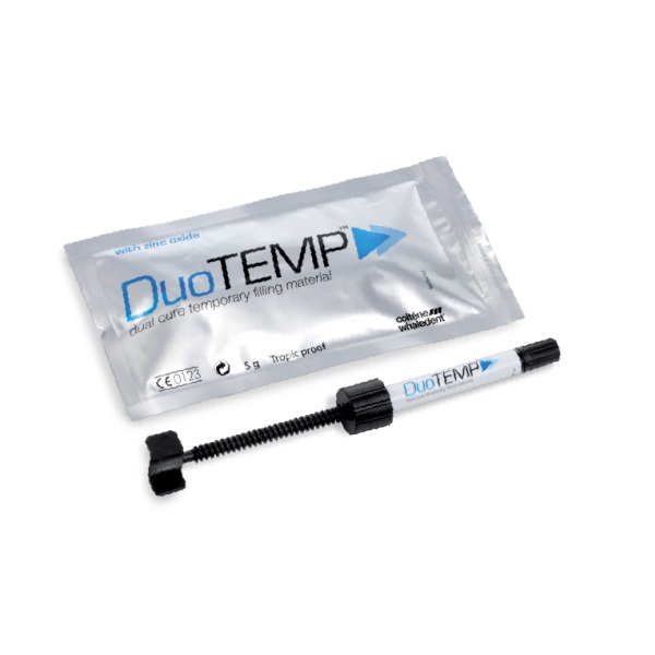 DuoTEMP es un material de obturación temporal de doble polimerización. Se trata de un material blanco sin eugenol, radiopaco y formulado a base de óxido de zinc y sulfato de zinc para una protección óptima de la infiltración de bacterias. DuoTEMP se puede curar con luz y con saliva. Al cabo de tan solo 40 s de fotopolimerización, el paciente puede cargar inmediatamente el material.