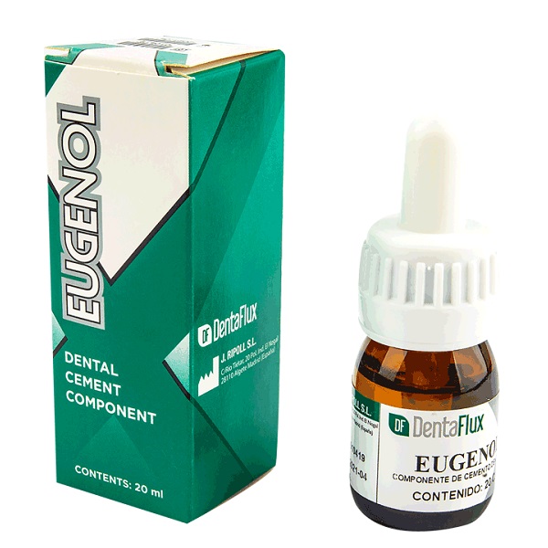 Eugenol Dentaflux. Se utiliza como sellador en endodoncia, tiene efecto anestésico e interviene en el fraguado de las resinas. Envase de 20ml.
