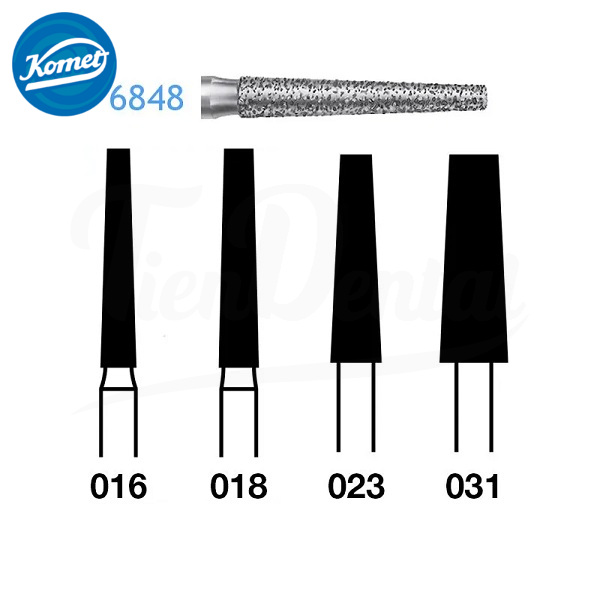 Fresa Turbina Diamante Cónica Larga con hombro 6848.314 Komet 5 Uds. Fresa de diamante cónica alargada con hombro y grano grueso. Para uso en turbina (FG). 5 unidades.