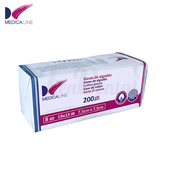 Gasa algodón no estéril Medicaline. Fabricadas en algodón 100% no estéril. Medidas: 7,5cm x 7,5 cm. Paquete con 200 unidades.