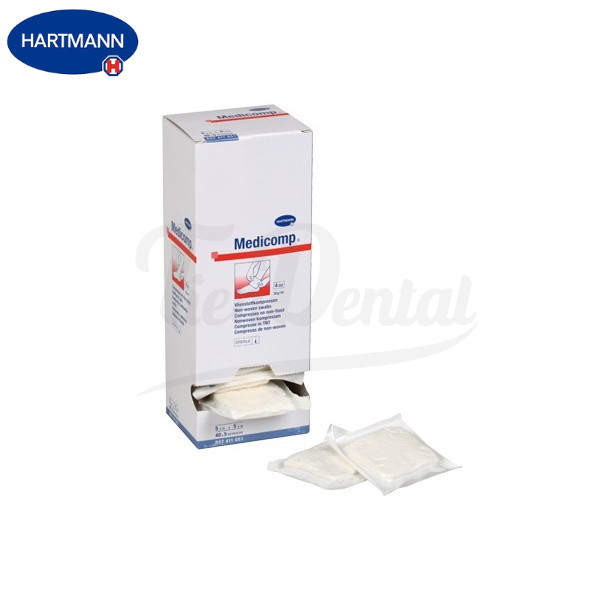 Gasas Estériles Medicomp Hartmann 5 x 5cm 200 Uds. Compresas estériles para el cuidado general de heridas. 4 capas, 4 espesores. 40 paquetes de 5 unidades.