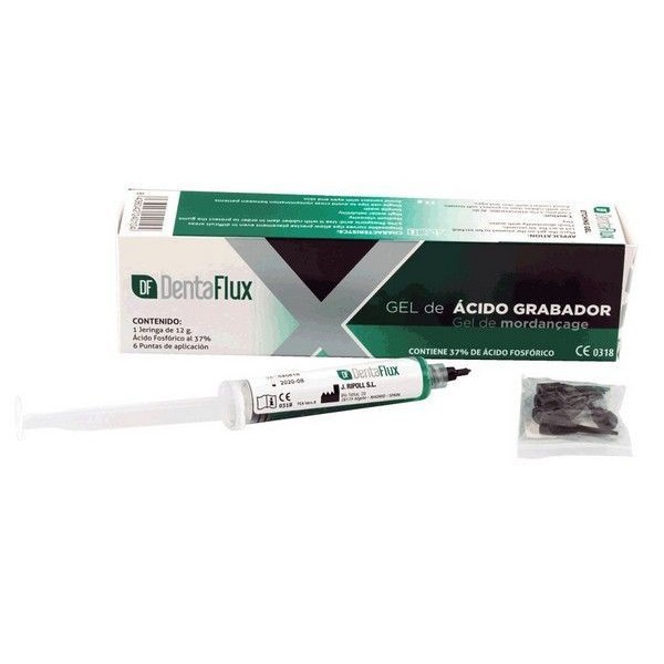 Gel Ácido Grabador Color Verde Dentaflux 37% Jeringa 12g. Desmineraliza el esmalte dental creando microporos que permiten una mayor adhesión de los materiales de restauración.