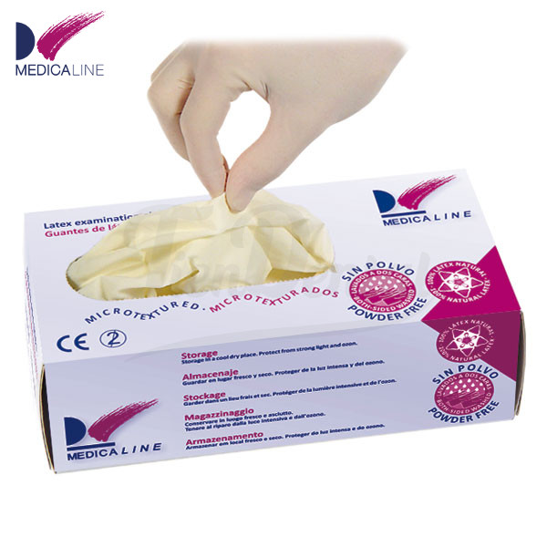 Guante látex sin polvo Medicaline. Caja de 100 unidades. 100% látex natural. Adherentes y resistentes. Disponibles en 4 tallas diferentes.