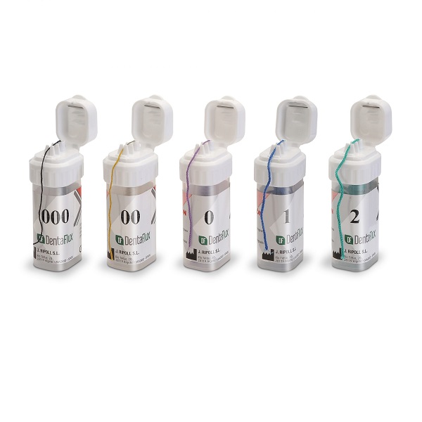 Hilo de retracción Dentaflux. Hilo trenzado no impregnado que se utiliza para retraer la encía rodeándola con el hilo impregnado en solución de retracción.