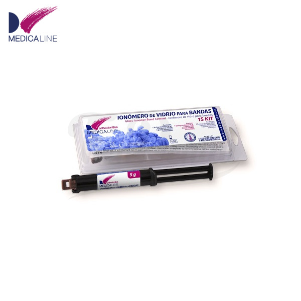 Ionómero de Vidrio para Bandas ML Ortho Medicaline. De fraguado dual, muy fácil de limpiar y con un color azul de alto contraste.