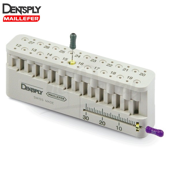 Instrumento ideal para medir la longitud de las limas, puntas de papel y Gutapercha utilizando una sola mano.