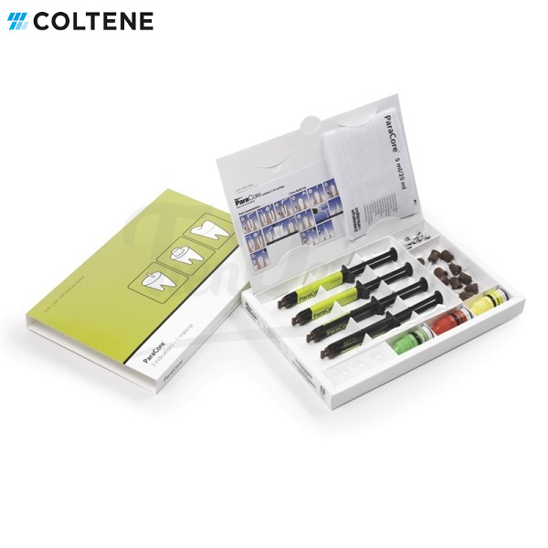 ParaCore Cemento Coltene Kit Intro. Sistema de composite radiopaco de resina de composite de doble polimerización reforzada con vidrio disponible en tres tonalidades.