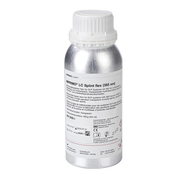 Resina Impresión 3D IMPRIMO LC Splint Flex Transparent 500 gr. Para la fabricación de férulas oclusales transparentes de alta precisión, así como para bruxismo y protrusión mandibular.