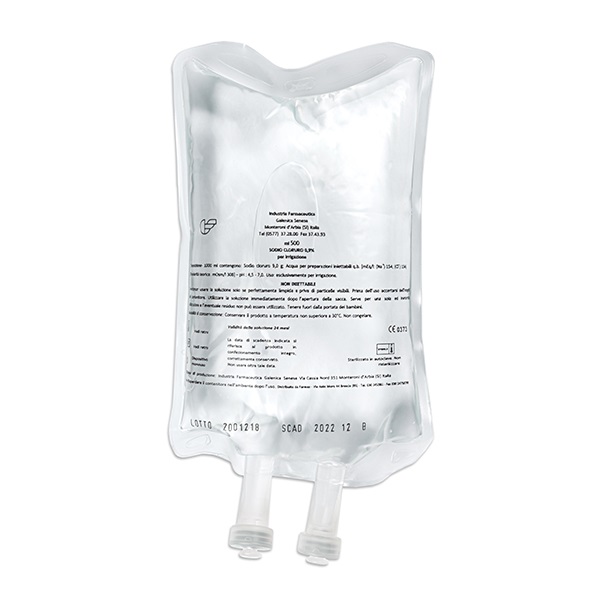 Suero Estéril 500ml. Solución salina isotónica al 0,9% de cloruro de sodio para enfriar instrumentos quirúrgicos giratorios u oscilantes durante la cirugía dental.