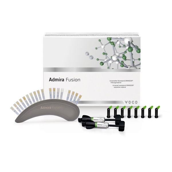 - 9 cápsulas de 0,2 g (3 de A2, 3 de A3, 3 de A3.5) 1 jeringa de Admira Fusion Flow A3 de 2 g, 3 cápsulas de 0,2 g de Admira Fusion x-tra universal, accesorios.