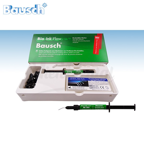 Bio-Ink®-Flow está destinado para marcar puntos, áreas y líneas en la mucosa oral, como úlceras, la linea de vibración (línea AH), bandas de la mucosa, pliegues y rebordes de la prótesis.
