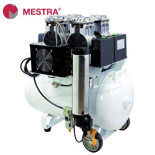 Compresor a pistón seco Mestra 160l con secador. Destaca su funcionamiento silencioso (inferior a los 60 dB), su sencillo mantenimiento, y su excelente fiabilidad.