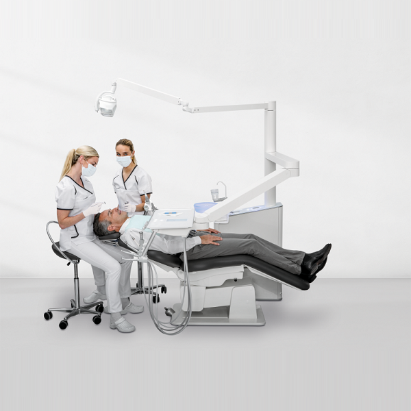 La unidad auxiliar se coloca en un brazo telescópico flexible, los que garantiza la mejor posición con tratamientos de dos o cuatro manos. Al mismo tiempo, el cambio entre el tratamiento dental derecho e izquierdo dura solo unos segundos, sin necesidad de utilizar herramientas, colocando el brazo telescópico en el sillón del paciente.