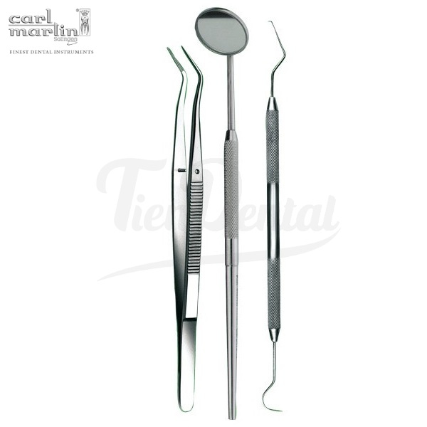 Kit de exploración Carl Martin. Juego de instrumentos para primera exploración. Contenido: pinza de exploración, 1 explorador doble y 1 espejo con mango.