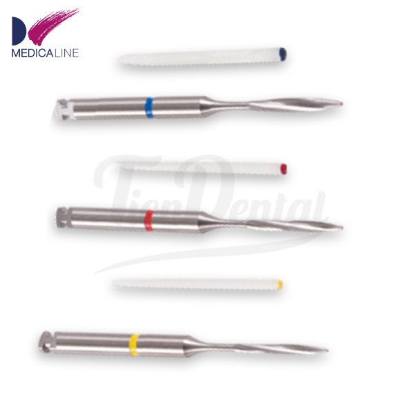 Kit Postes y fresas m-Post Medicaline. Forma cilíndrica con conicidad en la punta. Modulo elástico similar a la dentina. Menor riesgo de fracturas.
