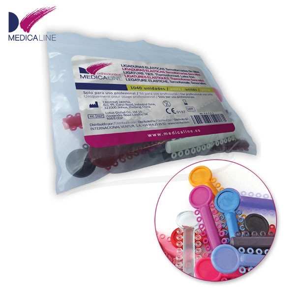 Ligaduras elásticas Medicaline termoformadas sin látex. Alta elasticidad. Libres de látex. Disponibles en 12 colores. Envase de 1040 unidades.