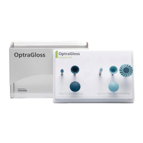 OptraGloss consta de un pulidor de diamante azul oscuro para el prepulido y un pulidor de diamante azul claro para el pulido de alto brillo. Para el pulido en un solo paso de las obturaciones de resina compuesta, sólo se necesita el pulidor de alto brillo. Los pulidores están disponibles en forma de "Copa", "Llama", "Lente" y ahora también "Rueda Espiral"