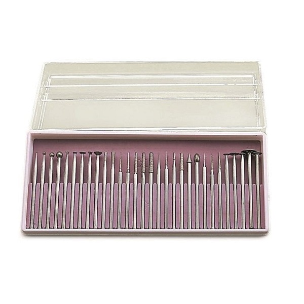 Set 30 fresas diamante para pieza de mano Mestra. El set cuenta con un estuche que recoge las 30 formas que con más frecuencia se emplean en el laboratorio dental.